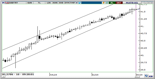 USDTRY’de süregelen yükseliş hareketi, günlük grafikteki yukarı yönlü kanal formasyonu ile desteklenirken, kısa vadede 41,20 – 42 aralığında fiyatlamaların ön planda olduğu görülüyor. Teknik görünüm, kademeli yükseliş trendinin devam ettiğini işaret ederken, 41,20 seviyesinin altına doğru kalıcı bir geri çekilmenin zor olduğunu ortaya koyuyor. USDTRY’de 41,18, 41,10 ve 41,06 seviyeleri yakın vadeli destek konumunda yer alıyor.