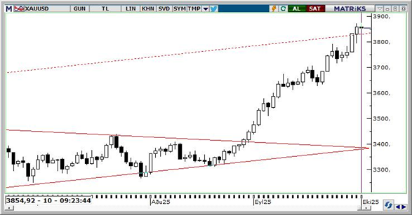 Altın için orta-uzun vadeli görünümümüzde beklentimiz yukarı yönlü olmaya devam ediyor. Teknik indikatörler, kısa vadede 3.750$ seviyesinin altında kalıcı bir geri çekilme olasılığının düşük olduğunu gösteriyor. Olası düzeltmeler açısından ise belirttiğimiz 3.850 – 3.870 aralığından tepki satışları gerçekleşti. Aşağıda ise 3.830$, 3.790$ ve 3.735$ seviyeleri kısa vadeli destek konumunda. Bu kapsamda, geri çekilmeleri bir alım fırsatı olarak görüp, sınırlı kalmasını bekliyoruz. Direnç olarak ise 3.875$ – 3.900$ takip edilebilir.