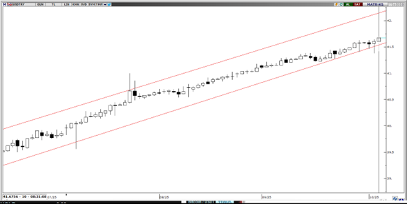 USDTRY’de istikrarlı biçimde süren yukarı yönlü hareket, günlük periyotta görülen yükseliş kanalıyla paralellik gösteriyor. Bu çerçevede, kısa vadede 41,20–42 bandında fiyatlamalar öne çıkarken, görünüm kademeli trendin sürdüğünü ve 41,20 seviyesinin altında kalıcılığın güç olduğunu işaret ediyor. Destek seviyeleri olarak 41,40 ve 41,20 seviyeleri takip edilebilir.
