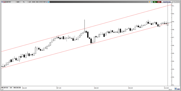 EUR/TRY 46,5–49,25 bandında hareketini sürdürüyor. 48,50 seviyesinin altına olabilecek geri çekilmelerin sınırlı kalması beklenirken, bu seviyenin altında 48,20 desteğinden güçlü alımların gelmesiyle toparlanma ihtimalinin yüksek olduğu öngörüyoruz. Teknik göstergeler, kısa vadede 48–49,50 aralığında dalgalanmanın devam etmesine ve yukarı yönlü trendin kademeli olarak sürmesine işaret ediyor. 48,20 ve 48,15 destek; 49,20 ise direnç olarak takip edilebilir.