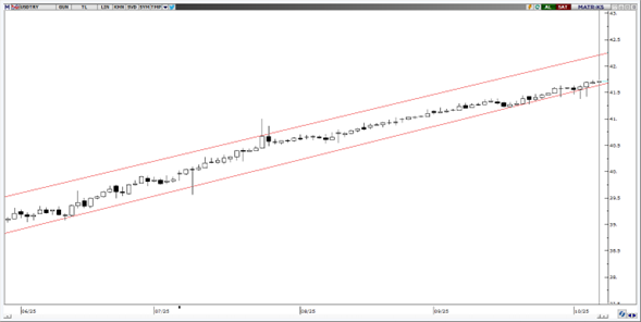 USDTRY’de süregelen yükseliş eğilimi, günlük periyotta takip edilen yukarı yönlü kanal yapısıyla paralel bir görünüm ortaya koyuyor. Teknik olarak, kısa vadede 41,20–42 bandındaki fiyatlamalar öne çıkarken, genel eğilim kademeli trendin sürdüğüne ve 41,20 seviyesinin altına yerleşmenin güçleştiğine işaret ediyor. Destek seviyeleri olarak 41,40 ve 41,20 seviyeleri takip edilebilir.