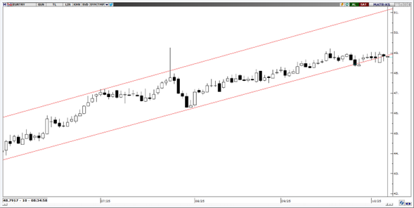 EUR/TRY paritesi 46,5–49,25 aralığında hareketini sürdürüyor. 48,50 seviyesinin altına olası geri çekilmelerin sınırlı kalması beklenirken, bu seviyenin altında 48,20 desteğinden gelebilecek alımların toparlanmayı destekleyebileceği değerlendiriliyor. Teknik görünüm, kısa vadede 48–49,50 bandında dalgalanmanın devam edeceğine ve yukarı yönlü trendin kademeli biçimde korunduğuna işaret ediyor. 48,20 ve 48,15 destek; 49,20 ise direnç olarak takip edilebilir.