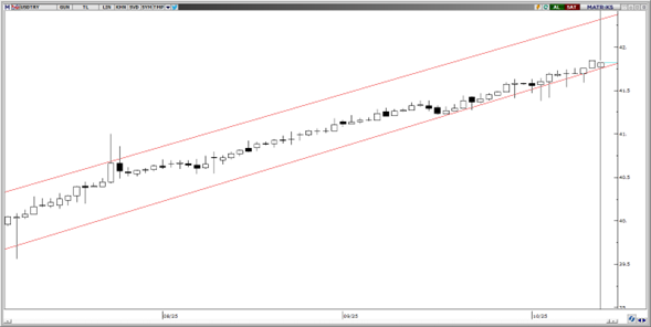 USDTRY’de süregelen yukarı yönlü eğilim, günlük grafiklerde izlenen yükseliş kanalıyla paralel bir seyir izliyor. Teknik görünüm, kısa vadede 41,20–42 bandında fiyatlamaların ön planda olduğunu, genel trendin kademeli olarak yukarı yönlü seyrini koruduğunu ve 41,20 seviyesinin altına gerilemenin zayıf bir olasılık olduğunu gösteriyor. Destek seviyeleri olarak 41,40 ve 41,20 seviyeleri takip edilebilir.