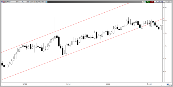 EUR/TRY paritesi 46,5–49,25 aralığında dengeli bir görünüm sergiliyor. 48,50 seviyesinin altına olası geri çekilmelerin sınırlı kalması beklenirken, 48,20 desteğinden gelebilecek tepki alımlarının kısa vadeli toparlanmayı desteklemesi olası görünüyor. Teknik görünüm, paritenin 48–49,50 bandında yatay hareketini sürdürürken, yukarı yönlü trendin kademeli şekilde korunabileceğine işaret ediyor. 48,20 ve 48,15 destek; 49,20 ise direnç olarak takip edilebilir.