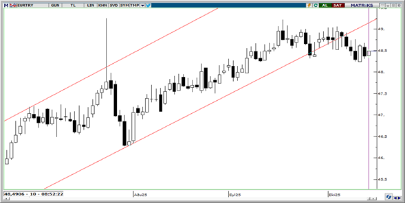 EUR/TRY paritesi 46,5–49,25 bandında istikrarlı bir seyir izliyor. 48,50 seviyesinin altına yaşanabilecek olası geri çekilmelerin sınırlı kalması beklenirken, 48,20 desteğinden gelebilecek tepki alımlarının kısa vadeli toparlanmayı desteklemesi öngörülüyor. Teknik görünüm, paritenin 48–49,50 aralığında yatay hareketini sürdürürken, yukarı yönlü trendin kademeli olarak korunabileceğini gösteriyor. 48,20 ve 48,15 destek; 49,20 ise direnç olarak takip edilebilir.