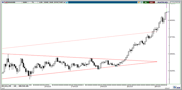Altın’da orta–uzun vadeli pozitif eğilim korunuyor. Fiyat, daha önce izlenen 3.700–4.000 bandının üst eşiğini güçlü bir ivmeyle aşarak yükseliş trendini teyit etti. Teknik göstergeler, 3.900$ seviyesinin altında kalıcılığın zayıf bir olasılık olduğunu gösteriyor. Geri çekilmelerde ise 3.950$, 3.880$ ve 3.820$ seviyeleri kısa vadeli destek bölgeleri olarak izleniyor. Bu kapsamda, sınırlı düzeltmelerin alım yönlü fırsat olarak değerlendirilebileceğini öngörüyoruz. Güçlü talep ve faiz indirimi beklentileriyle yeni hedeflerin artık 4.000 doların üzerinde oluştuğu görülüyor. Direnç olarak ise 4150$ takip edilebilir.