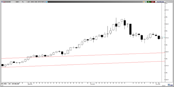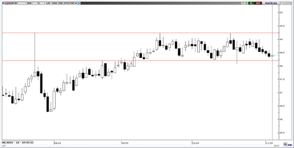 EUR/TRY paritesi 46,50 – 49,25 kanalın içinde yatay hareketine devam ediyor. Kanalın alt bandından gelen tepkinin kalıcı olması halinde üst banda kadar bir hareket beklemek mümkün. Teknik indikatörler alt banttan gelen tepki hareketi devam etmediği takdirde 47,50 seviyesine kadar bir gerileme olabileceğine işaret ediyor. 48 seviyesi destek; 48,70 ve 49,00 ise direnç seviyeleri olarak izlenebilir.