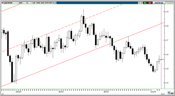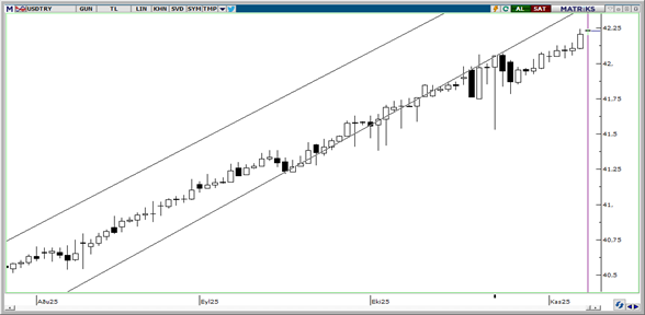 2025 ve 2026 yıl sonu kur tahminlerimiz çerçevesinde, Türk lirasının yakın vadede dolar karşısında reel değer kaybı yaşamasını beklemiyoruz. Paritenin kanal içinde hareketine devam etmesi bizlere kademeli yükseliş eğiliminin devam ettiğini gösteriyor. Trend ve momentum indikatörleri, yıl sonuna kadar 42 – 44 bandının göz önünde olacağının sinyalini vermekle beraber aynı zamanda 42 seviyesinin altına düşüşlerin zor olacağına işaret ediyor. Kurda 42 ve 41,85 seviyelerini kısa vadeli destek olarak takip ediyoruz.