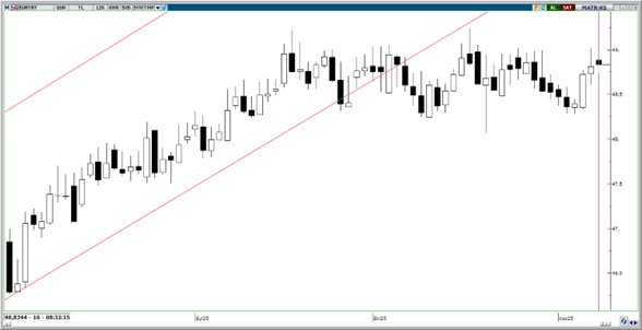 Parite, beklentimiz doğrultusunda yatay kanalın üst bandına doğru hareketini sürdürüyor. Paritenin kısa vadede 47,5 – 50 bandında işlem görmesini, ardından yükselişini 50 seviyesi üzerine taşımasını bekliyoruz. Teknik göstergeler, kanalın üst sınırına denk gelen 49,25 seviyesinin aşılmasıyla beraber 50 seviyelerine momentumlu hareketin devam edebileceğine işaret ediyor. Kurda 48,20, 47,55 ve 47,15 seviyeleri kısa vadeli destek; 49,50 ve 49,00 ise direnç seviyeleri olarak takip edilebilir.