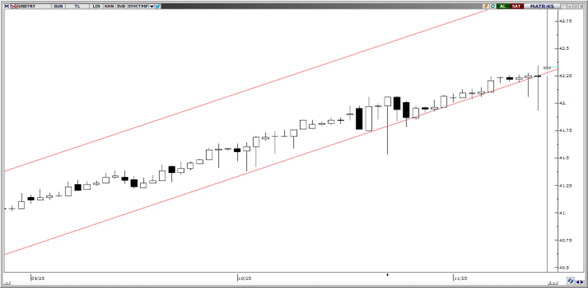 Bu sabah parite yeni tarihi seviyelerini olan 42,33 civarında işlem görmeye devam ediyor. Teknik indikatörler, kurdaki kademeli yükseliş trendinin devam edeceğine işaret ediyor. Teknik göstergeler doğrultusunda yıl sonuna kadar 42 - 44 bandında bir hareket bekliyoruz. Paritede 42,25, 42,10 ve 41,85 seviyelerini kısa vadeli destek seviyeleri olarak takip edilebilir.