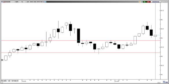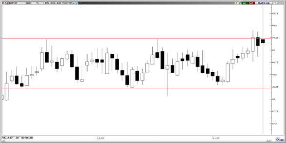 Günlük grafikteki kanalın üst çizgisinden direnç gören paritede, teknik sinyaller doğrultusunda kısa vadede 47,50-50 bandında bir hareket bekliyoruz. İndikatörler, kanalın üst bandına tekabül eden 49,25 seviyesinin üzerinde kapanışlar gerçekleşirse, 50 seviyelerine doğru hareketin devam edebileceğini gösteriyor. Kurda 49,00, 48,75 ve 48,40 seviyeleri kısa vadeli destek; 49,50, 49,75 ve 50,00 ise direnç seviyeleri olarak takip edilebilir.