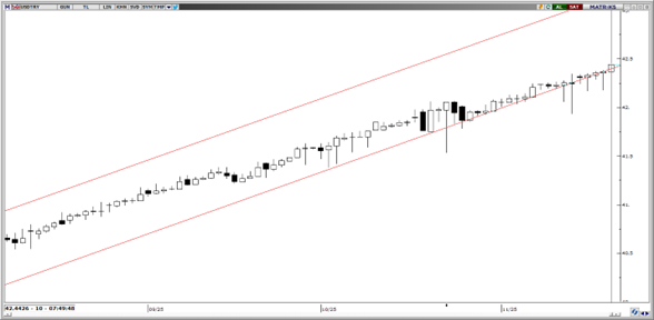 Tüm zamanların en yüksek seviyesinden işlem gören parite 42,45 seviyelerinde yükseliş hareketine devam ediyor. Teknik göstergeler doğrultusunda bu kademeli yükseliş hareketin yıl sonuna kadar 42 – 44 aralığında devam etmesini bekliyoruz. Paritede 42,30, 42,25 ve 42,10 seviyelerini kısa vadeli destek seviyeleri olarak takip edilebilir.