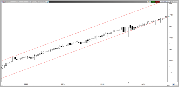 Bu sabah 42,40 seviyesinden işlem görmekte olan USD/TRY’de, teknik ve temel dinamikler çerçevesinde kademeli yükseliş eğiliminin devamını bekliyoruz. Teknik göstergeler, yıl sonuna kadar 42 – 44 aralığında bir hareket ihtimalini destekliyor. Paritede 42,30, 42,25 ve 42,10 seviyelerini kısa vadeli destek seviyeleri olarak izlenebilir.