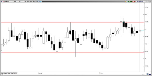 48,95 seviyelerinde konsolide hareketine devam eden paritede, teknik indikatörler kısa vadede 47,50 – 50,00 bandında bir hareket bekleyebileceğimizi gösteriyor. Yatay kanalın üst bandının geçtiği 49,25 bölgesinin yukarı yönlü kırılmasını halinde ise, yükselişin 50 seviyesine doğru hız kazanması beklenebilir. Kurda 48,75, 48,40 ve 48,20 seviyeleri kısa vadeli destek, 49,50, 49,75 ve 50,00 seviyeleri ise direnç olarak takip izlenebilir.