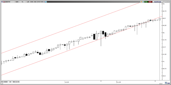 Yukarı yönlü hareketine devam eden parite bu sabah 42,50 üzerini test ederek rekor tazeledi. Teknik göstergeler, günlük grafikte devam eden yükseliş kanalının altına sarkan hareketlerin kalıcı olmayabileceğini ve yükseliş eğiliminin yıl sonuna kadar 42 – 44 aralığında devam edebileceğini gösteriyor. Paritede 42,30, 42,25 ve 42,10 seviyelerini kısa vadeli destek seviyeleri olarak takip edilebilir.