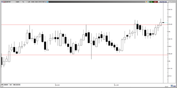 Paralel kanalın üst bandını kendine destek olarak kullanan parite yukarı yönlü hareketine devam ediyor. Teknik indikatörler, kısa vadede hareketlerin 47,50 – 50,00 bandı içerisinde gerçekleşeceğini gösteriyor. 48,75, 48,40 ve 48,20 seviyeleri kısa vadeli destek, 49,50, 49,75 ve 50,00 seviyeleri ise direnç olarak takip edilebilir.