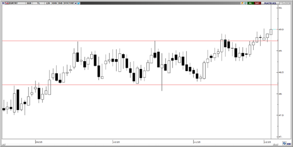 EUR/USD paritesinde yaşanan yükseliş EUR/TRY kuruna da yansıyor. Kurda 49,50 direncinin test edildiğini gözlemliyoruz. Teknik olarak kısa vadeli destek seviyeleri 48,80, 48,40 ve 48,20 olurken; dirençler 49,50, 49,75 ve 50,00 seviyelerinde bulunuyor.