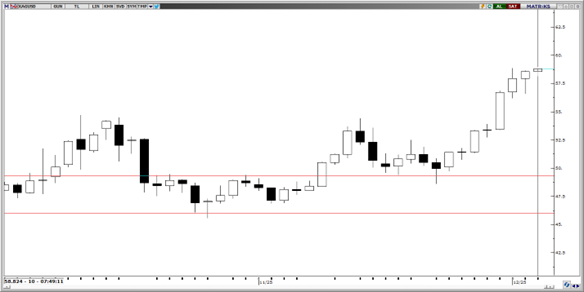Sabah saatlerinde 58,95 $/ons ile tüm zamanların en yüksek seviyesini tekrardan tazeleyen gümüşte, gerek dolar endeksindeki aşağı yönlü hareket, gerek güvenli liman arayışı ile yükseliş eğilimi sürüyor. Teknik indikatörler olası bir tepki satışında gümüşün 54,50 $/ons seviyesine kadar gerileyebileceğini gösteriyor. 58,85 $/ons direnci üzerinde fiyatın tutunabilmesi halinde 60 $/ons’a kadar yükselişin devamını görme ihtimali mevcut.