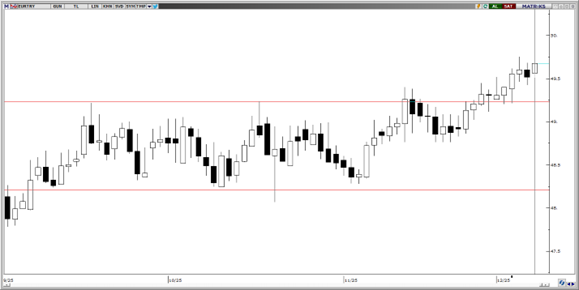 Kendine 49,50 seviyesinden destek bulup yukarı yönlü hareketine devam eden paritede, teknik göstergeler 49,50 altına kalıcı hareketlerin gerçekleşme ihtimalinin zayıf olduğunu gösteriyor. Bu doğrultuda hareketin 50,00 seviyesine kadar devam edip, o seviyelerden kısmi tepki satışları ile karşılaşabileceği görüşündeyiz. 49,50, 49,25 ve 49,00 seviyeleri destek; 49,75 ve 50,00 seviyeleri ise direnç olarak takip edilebilir.