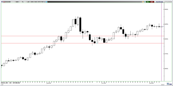 Geçtiğimiz haftadan itibaren yatay hareketini sürdüren altın, sabaha saatlerinde 4.210 seviyelerinden işlem görmekte. Teknik göstergeler 4.050 seviyesinin altına kalıcı hareket gerçekleşme olasılığının düşük olduğunu gösteriyor. Ayrıca 4.215 seviyesi üzerinde yapılacak günlük kapanışların, altının hareketini 4.375 seviyesine kadar devam ettirmesini tetikleyeceğini göstermekte. 4.200, 4.140 ve 4.085 seviyeleri destek; 4.245 ve 4,335 seviyeleri ise direnç olarak takip edilebilir.
