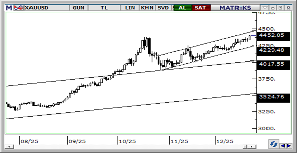 ABD’nin Venezuela açıklarında ikinci bir gemiye el koyması ile artan jeopolitik gerilim ve Fed’in faiz indirimlerine devam edeceği beklentileri ile birlikte değerli metaller haftaya rekorlarla başladı. Bu sabah %1,5 primle 4.400$ üzerini test ederek rekor tazeleyen ons altında, teknik görünüm kısa vade için 4.250$ - 4.500$ bandında bir hareket ihtimalini destekliyor. Altın/gümüş rasyosunun 64 seviyesinin altına gerileyerek Şubat 2021’den bu yana en düşük düzeyine inmesi de, altına yönelik potansiyelin sürdüğüne işaret ediyor. Ons altında 4.380$, 4.330$ ve 4.270$ seviyeleri destek, 4.410$ ve 4.450$ direnç olarak izlenecek.