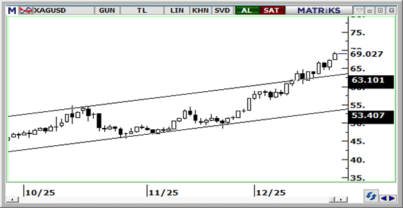 Artan jeopolitik riskler ve Fed’e ilişkin faiz indirim beklentilerinin desteği ile birlikte bu sabah %3’e yakın primle 69,46$ üzerini test eden gümüş, rekor tazelemeye devam ediyor. 64 seviyesi altına inerek yaklaşık 5 yılın en düşük seviyelerine inen altın / gümüş rasyosu, gümüş fiyatlarında kısa vadede bir düzeltme olasılığının göz ardı edilmemesi gerektiğine işaret ediyor. Gümüşte 70$ bölgesini psikolojik direnç olarak takip ediyoruz. Aşağıda ise 67,50$ 66,60$ ve 65,30$ seviyeleri destek konumunda.
