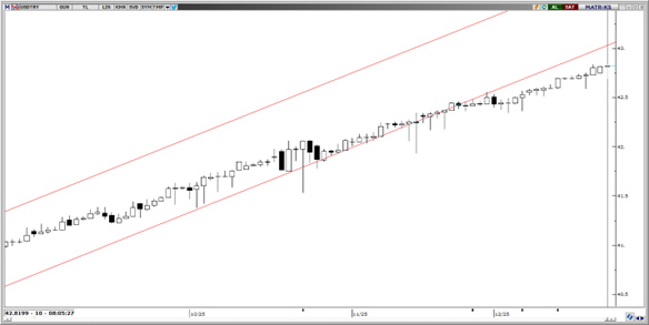 43 seviyesi yakınlarında yıllık kapanış beklediğimiz parite, yukarı yönlü hareketine devam ediyor. Teknik göstergeler, yıl sonuna kadar 43 seviyesine kadar yükselişin devam etme ihtimalinin kuvvetli olduğunu işaret ediyor. 43 seviyesi direnç olarak; 42,70, 42,60 ve 42,35 seviyeleri ise destek olarak takip edilebilir.