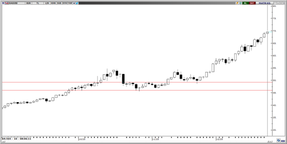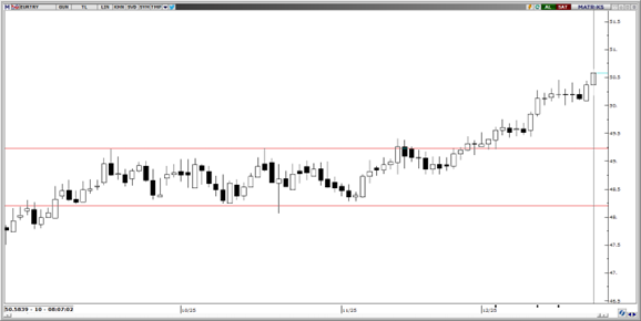 50,65 ile yeni tarihi zirve seviyesini gören parite, bu sabah 50,63 seviyelerinden işlem görmekte. Teknik indikatörler, 50,35 üzerinde fiyatın tutunabilmesi halinde yukarı yönlü hareketin devam edeceğini gösteriyor. 50,15, 50 ve 49,90 seviyeleri kısa vadeli destek konumunda. Yukarıda ise 50,65 seviyesi direnç olarak takip edilebilir.