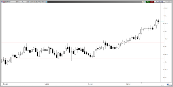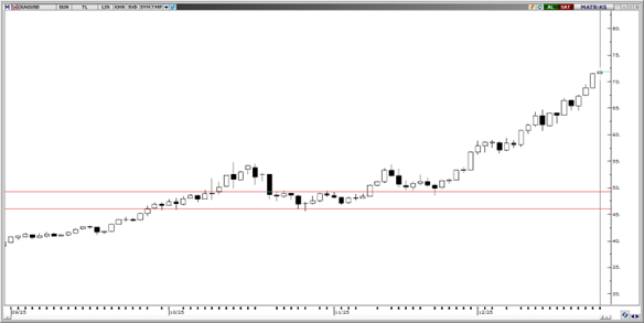 Tarihi zirve olan 50,80 seviyesinden kısmi satış ile karşılasan parite için teknik indikatörler, fiyatın 50,30 seviyesini destek olarak kullanıp yukarı yönlü hareketine devam etme olasılığının kuvvetli olduğunu gösteriyor. 50,15, 50 ve 49,90 seviyeleri kısa vadeli destek konumunda. 51 seviyesi ise psikolojik direnç olarak izlenebilir.