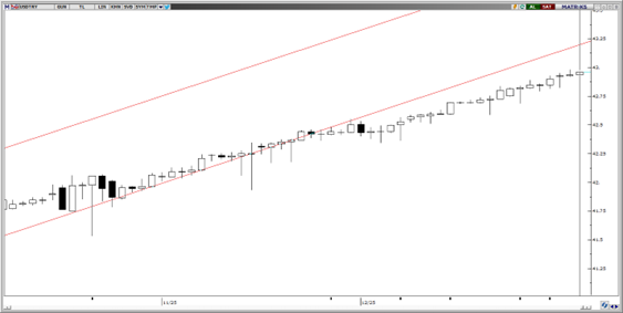 Kanal alt bandının hemen altında yükseliş trendine devam eden parite için teknik göstergeler, yukarı yönlü hareketin devam etme ihtimalinin güçlü olduğuna işaret ediyor. 43,00 seviyesi direnç olarak takip edilebilecekken; 42,50, 42,40 ve 42,34 seviyeleri destek konumunda yer alıyor.