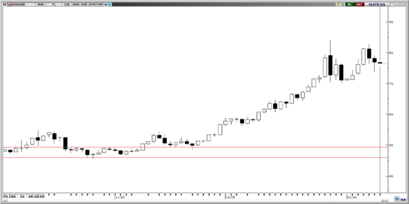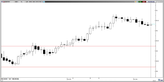 50,25 seviyesinden kendine destek bulan parite konsolide hareketine devam ediyor. Teknik göstergeler, ana trendin yukarı yönlü olup 50,00 seviyesinin altına gerçekleşecek fiyat hareketlerin kalıcı olma ihtimalinin düşük olduğuna işaret ediyor. 50,00, 49,50 ve 49,25 seviyeleri destek; 50,75 ise direnç olarak izlenebilir.
