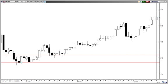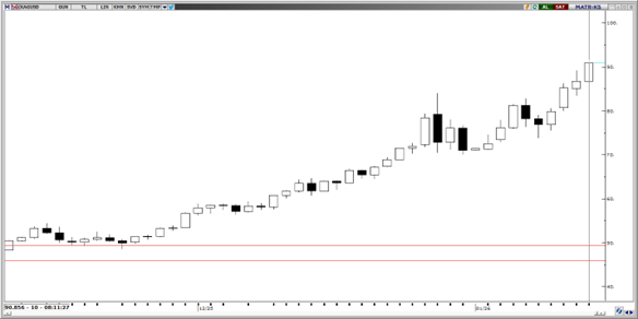 Gümüş, 91,50$ ile yeni tarihi zirvesini görmüş durumda. Dünya genelinde yaşanan karışıklıklar ve Fed’in yatırımcılara güven sağlayamamasından kaynaklı olarak artan gümüş için teknik göstergeler, yukarı yönlü trendin devam ettiğine işaret ediyor. Olası kar realizasyonunda 84,00$ seviyesine doğru geri çekilme ihtimali bulunan gümüşün bu noktanın üzerinde kalıcı olabilmesi halinde yukarı yönlü hareketin devam etme ihtimalinin kuvvetli olduğunu gösteriyor. Gümüşte 84,00$, 82,70$ ve 80,00$ seviyeleri destek; 91,50$ ve 92,00$ seviyeleri ise direnç olarak takip edilebilir.