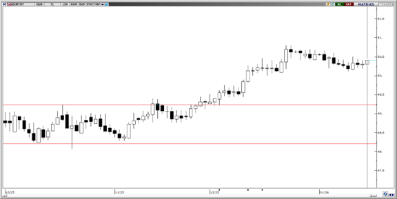 Yatay yönlü konsolide hareketine devam eden parite bu sabah 50,40 seviyesinden işlem görmeye devam ediyor. Teknik görünüm, 50,25–50,00 aralığının aşağısına kalıcı fiyat hareketleri gerçekleşme ihtimalinin düşük olduğunu gösteriyor. Kısa vadeli ukarı yönlü momentumun devam etmesini bekliyoruz. 50,00, 49,50 ve 49,25 seviyeleri destek; 50,75 ise direnç olarak takip edilebilir.