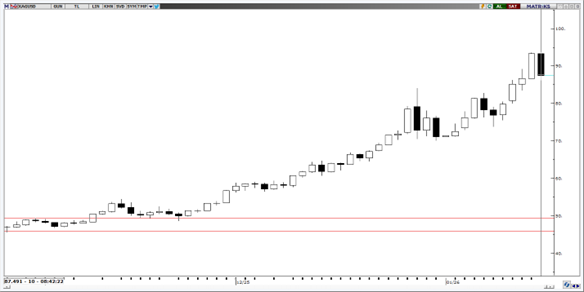 43,19 seviyesini gören parite yeni tarihi zirve seviyelerinden işlem görüyor. Teknik göstergeler, yükseliş trendinin devam etme eğiliminin yüksek olduğunu işaret ederken, aşağı yönlü kalıcı hareketler gerçekleşme ihtimalinin ise güç olduğunu vurguluyor. 43,50 direnç; 42,50, 42,40 ve 42,34 seviyeleri destek olarak takip edilebilir.