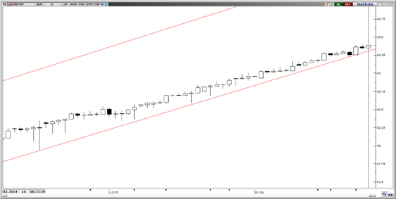 Kanal içerisindeki hareketini sürdüren USD/TRY'de kademeli yükseliş eğilimi korunuyor. Teknik görünüm, yakın vadede 43,50 seviyesine doğru yükselişin devam edeceğine işaret ediyor. Ayrıca olası geri çekilmelerde 42,50 kritik seviye olarak önem taşıyor. Bu seviyenin altında ise 42,40 ve 42,34 seviyeleri izlenecek alt destek bölgeleri konumunda bulunmakta.
