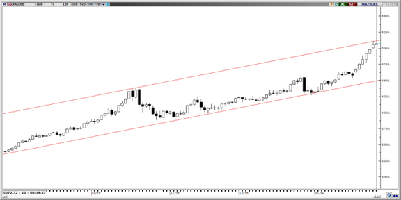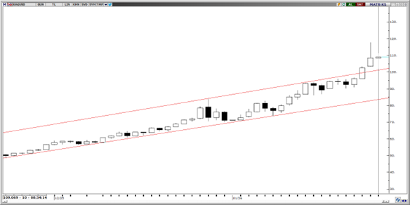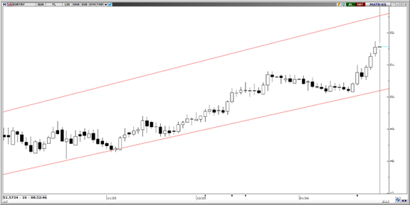 Yükselen kanalın üst bandına hareketini devam ettiren parite bu sabah 51,57 seviyesinden işlem görüyor. Teknik görünüm, yakın vadede 51,00 seviyesi altına kalıcı fiyat hareketleri gerçekleşme ihtimalinin zayıf olduğunu ve kısa vadede yukarı yönlü hareketin 52,50 seviyesine kadar devam edebileceğinin gösteriyor. 50,00, 49,50 ve 49,25 seviyeleri destek; 51,75 ve 52,50 seviyeleri direnç olarak takip edilebilir.