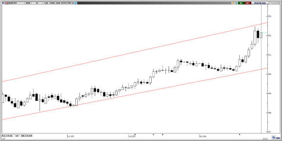 Kanalın üst bandına yakın bölgelerde seyrini sürdüren parite 52 seviyelerinde işlem görmeye devam ediyor. Teknik tablo, yakın dönemde 51,00 eşiğinin altında kalıcı bir seyir oluşma ihtimalinin zayıf kaldığını ortaya koyarken, kısa vadede yukarı yönlü hareketin 52,50 seviyesine doğru sürmesini destekliyor. 50,00, 49,50 ve 49,25 seviyeleri destek; 51,75 ve 52,50 seviyeleri ise direnç olarak izlenebilir.