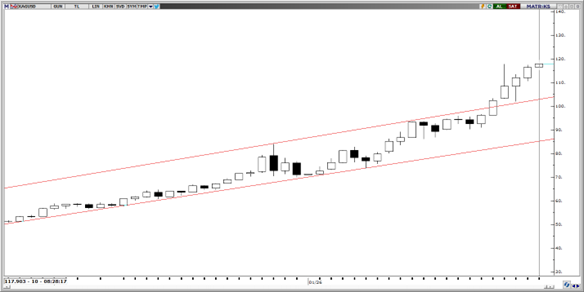 Gümüş 119,43 seviyesini görerek yeni tarihi zirvesini tazelemiş durumda. Teknik indikatörler, yakın vadede 100$ – 120$ bandında hareket ihtimalinin kuvvetli olduğuna işaret ederken, kanal üst bandına denk gelen 105$ seviyesinin olası geri çekilmelerde takip edilmesi gereken bir seviye olduğunu göstermekte. Yukarıda 120$ seviyesi direnç olarak izlenirken, aşağıda 106,45$, 105$ ve 103,50$ seviyeleri destek olarak takip edilebilir.