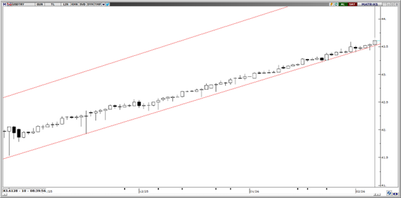 Kademeli yükselişine devam eden USDTRY, bu sabah 43,60 seviyesinden işlem görüyor. Olası geri çekilmelerin zayıf ve sınırlı kaldığı gözlemleniyor. Bu çerçevede 42,50 seviyesi, teknik görünümün korunması açısından kritik bir referans alanı olarak izleniyor. Söz konusu seviye üzerinde kalıcılık sağlandığı sürece, ana trendin korunduğu ve yukarı yönlü beklentilerin geçerliliğini sürdürdüğü değerlendiriliyor. 42,50’nin aşağı yönlü kırılması hâlinde ise 42,40 ve 42,34 seviyeleri bir sonraki destek alanları olarak izlenecek.