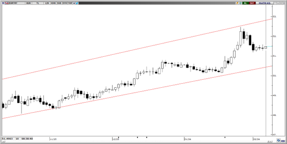 Paritenin yükselen kanal formasyonu içerisinde üst banttan geri çekilerek 51 seviyesine doğru daha dengeli bir fiyatlama davranışı sergilediği izleniyor. Bu süreçte paritenin konsolide olmaya devam ettiği görülürken, teknik görünümde 51 bölgesi kısa vadede fiyatlamanın denge bulabileceği kritik bir eşik olarak öne çıkıyor. Mevcut hareketin ana trend dinamikleri açısından henüz belirgin bir bozulmaya işaret etmediği değerlendiriliyor. Aşağı yönlü hareketlerde 51,00, 50,50 ve 50,00 bandı destek bölgesi olarak izlenirken, yukarı yönlü hareketlerde 52,00 ve 52,50 seviyeleri kısa vadeli direnç alanları olarak öne çıkıyor.