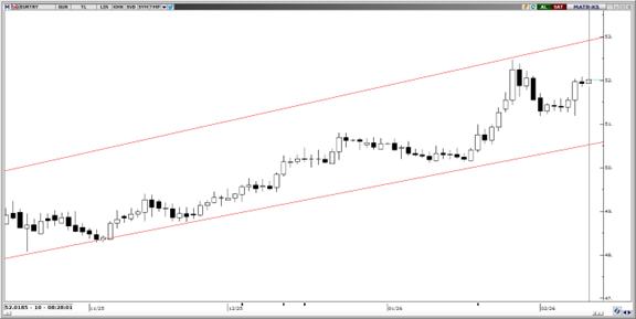 Yükseliş kanalı içerisindeki seyrini sürdüren EUR/TRY, 52 seviyesine ulaşmış durumda. Teknik göstergeler, kısa vadede 51 – 53 bandında bir hareketin ön planda olabileceğinin sinyalini verirken, yukarı yönlü ana eğilimin korunduğuna işaret ediyor. Paritede 51,85, 51,70 ve 51,55 seviyeleri kısa vadeli destek konumunda yer alırken, yukarıda ise 52, 52,20 ve 52,35 dirençleri yer alıyor.