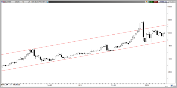 Altında yükselen kanal formasyonu geçerliliğini korurken, fiyatlamaların dar bantta ve yatay bir konsolidasyon sürecine girdiği görülüyor. Geri çekilmelerde momentumun sınırlı kalması, ana trendde belirgin bir zayıflama sinyali üretmiyor. 4.600$–4.650$ aralığı kısa vadede kritik destek bölgesi olarak öne çıkarken, bu banttan gelebilecek olası tepki alımları yükseliş eğiliminin sürdürülmesi açısından belirleyici olacaktır. 4.910$ ve 4.850$ seviyeleri ara destekler olarak takip edilirken, daha derin düzeltme senaryosunda 4.650$–4.000$ bandı ana destek alanı niteliğini koruyor. Yukarı yönlü hareketlerde ise 5.100$, 5.180$ ve 5.250$ seviyeleri direnç olarak takip edilebilir.