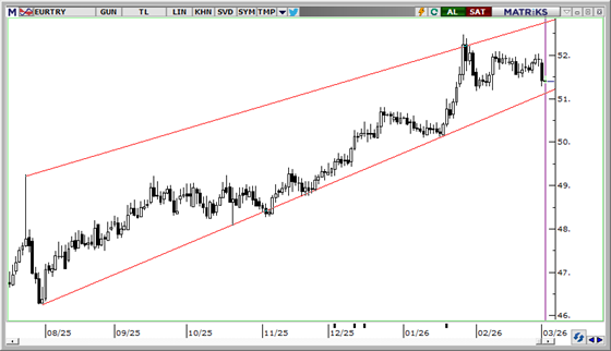 51,00 – 52,00 bandında yatay seyrini sürdürmekte olan EURTRY’de, teknik indikatörler ana yükseliş trendinin korunduğunu teyit ediyor. Olası geri çekilmelerin sınırlı kalmaya devam ettiği kurda, göstergeler yakın vadede 51 seviyesi üzerinde bir tutunma çabasına işaret ediyor. Aşağıda 51,30 ve 51 seviyeleri kısa vadeli destek olarak öne çıkarken; yukarıda 52 ve 52,20 seviyeleri direnç olarak takip ediliyor.