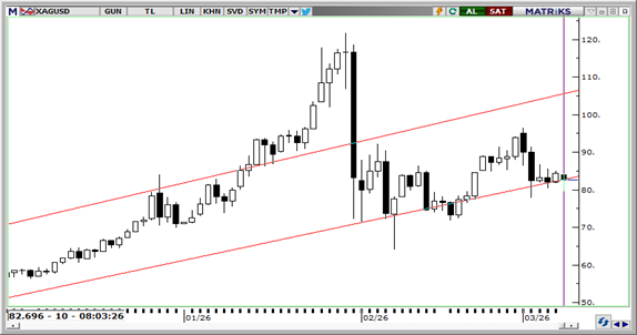Gümüşte yüksek oynaklık sürerken, fiyatların bu sabah 82,60$ seviyesine geri çekildiği görülüyor. Güçlü dolar ve faiz indirimi beklentilerinin ötelenmesi değerli metaller üzerinde baskı yaratırken, jeopolitik riskler dalgalı seyrin korunmasına neden oluyor. Teknik olarak 82,40$ seviyesi kısa vadede kritik eşik olmayı sürdürürken, aşağıda 82,40$, 80,00$ ve 77,25$ destek; yukarıda 86,22$, 87,80$ ve 90,00$ direnç olarak izlenebilir.