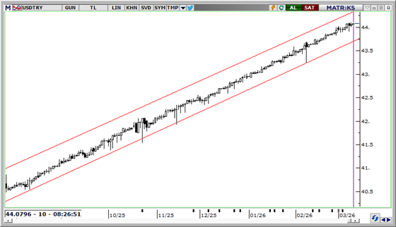 USD/TRY güne 44,08 seviyesinden başlarken, TCMB’nin sıkı likidite adımları kurdaki oynaklığı sınırlıyor. Orta Doğu kaynaklı riskler sürse de, Trump’ın çatışmanın beklenenden kısa sürebileceğine yönelik mesajları ve petroldeki geri çekilme ilk baskıyı bir miktar hafifletti. Buna rağmen kurda yukarı yönlü eğilim korunuyor. 44,00 seviyesi kritik; 44,10 üzerinde 44,20 ve 44,35 direnç, aşağıda 44,00, 43,90 ve 43,80 destek olarak izlenebilir.