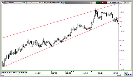 EUR/TRY’de sabah saatlerinde 50,8846 seviyesi izlenirken, kurun yönü üzerinde içeride sıkı likidite duruşu dengeleyici rol oynamaya devam ediyor. Buna karşılık küresel tarafta doların güçlü kalması ve enerji fiyatlarındaki yükseliş euroyu baskılıyor. Kısa vadede teknik olarak 50,85 seviyesi referans alınabilir; yukarıda 51,00, 51,20 ve 51,38 direnç, aşağıda 50,70 ve 50,50 destek konumunda.