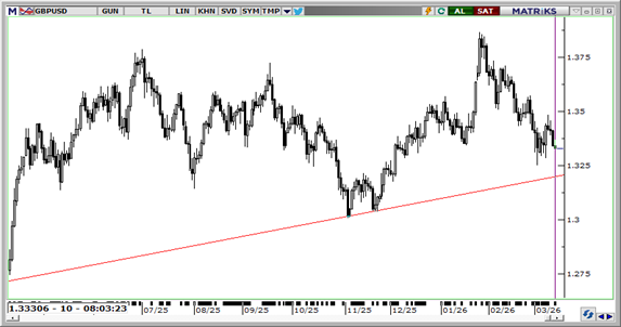GBP/USD güne 1,33310 yakınında başlarken, yükselen enerji fiyatlarının dolar lehine fiyatlamayı desteklemesi sterlin üzerindeki baskının korunmasına neden oluyor. Küresel tarafta savaş ve petrol kaynaklı belirsizlikler güvenli liman talebini canlı tutarken, paritede kısa vadede 1,3370 seviyesi ilk direnç bölgesi olarak takip edilebilir. Aşağıda 1,3325 ve 1,3290 destek; yukarıda ise 1,3425, 1,3450 ve 1,3500 seviyeleri öne çıkıyor.