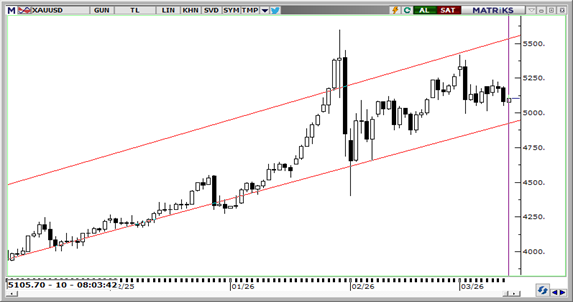 Ons altın güne 5.100$ civarında başlarken, jeopolitik risklerin sürmesi güvenli liman talebini desteklese de, Brent petrolün yeniden 100 dolar sınırına yönelmesiyle artan enflasyon kaygıları ve ötelenen faiz indirimi beklentileri fiyatlama üzerinde dengeleyici bir etki yaratıyor. Bu nedenle altında temkinli görünüm korunurken, 5.000$ bölgesi ilk önemli destek alanı olarak öne çıkıyor. Yukarı yönlü hareketlerde ise 5.145$, 5.200$ ve 5.250$ seviyeleri direnç olarak takip edilebilir.