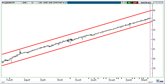 Piyasa faizlerinin %40 seviyesine yerleşmesi ve içeride sıkılaşan likidite koşulları ile birlikte TL’de hızlı değer kayıplarına yönelik riskler azalmış durumda. Kademeli yükseliş eğiliminin korunduğu USDTRY’de, bu sabah saatlerinde işlemler 44,20 civarında seyrediyor. Faiz indirim beklentilerinin zayıfladığı ve piyasa faizlerinde efektif 300 baz puanlık artışın yaşandığı mevcut ortamda, kurda sınırlı yükseliş eğiliminin devam etmesi beklenebilir. Teknik görünümde yukarı yönlü hareketlerde 44,25, 44,35 ve 44,50 seviyeleri direnç olarak izlenebilir. Olası geri çekilmelerde ise 44,00 ve 43,90 seviyeleri destek konumunda bulunuyor.
