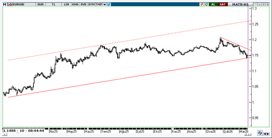EUR/USD paritesi sabah saatlerinde 1,1497 civarında işlem görürken petrolde gözlenen dalgalı seyir ve güçlü dolar teması parite üzerinde baskı yaratmaya devam ediyor. Enerji fiyatlarının euro bölgesi açısından maliyet tarafında yarattığı riskler ve Fed’e yönelik faiz indirimi beklentilerinin ötelenmesi yukarı yönlü hareketleri sınırlayan başlıca unsurlar olarak öne çıkıyor. Teknik görünümde aşağı yönlü hareketlerde 1,1480, 1,1450 ve 1,1400 seviyeleri destek olarak izlenebilir. Yukarı yönlü tepki denemelerinde ise 1,1525, 1,1555 ve 1,1590 seviyeleri direnç konumunda bulunuyor. Paritede 1,15 çevresindeki fiyatlama kısa vadeli yön açısından belirleyici olmaya devam ediyor.